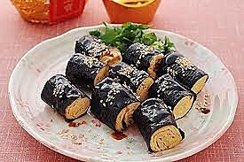 材料:大海苔數片、豆包、白芝麻少許。 調味:素烤肉醬。
