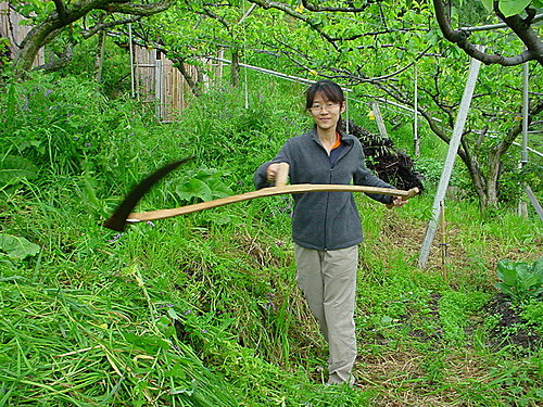 就是網路流傳此照片,揮灑瑞士博士男朋友專程帶來他家鄉大鐮刀除草