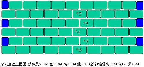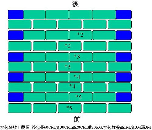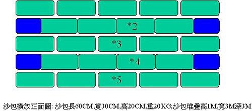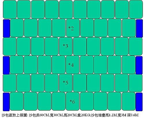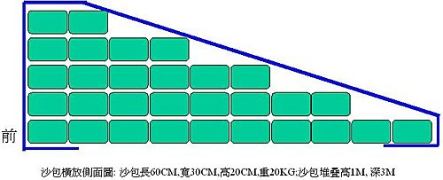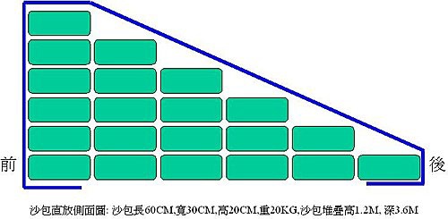 圖6-11: 要堆個寬3 米高1.5米厚5米之沙包至少要20公斤沙包360個以上,還要包上防水布,施工十分困難