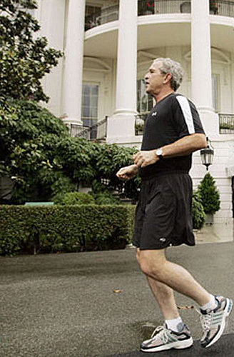 布希總統喜歡運動的確是人人皆知的,就是總統專機“空軍一號”上都配備有一臺“跑步機”,供布希總統隨時鍛鍊。不久前,布希總統還因喜歡跑步而出現<<跑步世界>>雜誌的封面上。
