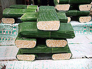 圖.天貝在印尼市場販售:以香蕉葉包裝.其他地區多用(透氣)塑膠袋包裝