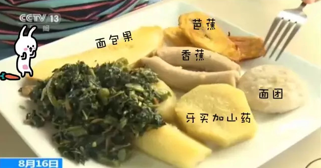 圖.牙買加餐廳: 麵包果、香蕉、芭蕉、麵團(玉米糊?)、黄山藥: